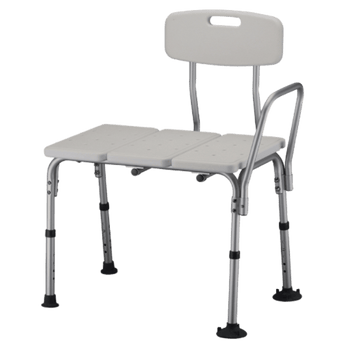 The Standard Transfer Bench with Back (9071) is designed with an extended seat to allow for seated user transfer and bathing. The back is push button removable and converts easily for left or right sides. The skid resistant rubber tips on the inside legs have an extra-wide suction base for added safety and security.
